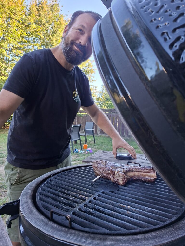 De geur van houtvuur en kip aan het spit hangt in de lucht.