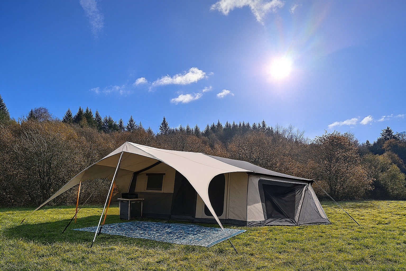 Binnen wacht comfort dat je hier misschien niet verwacht: een echt tweepersoonsbed, een knusse zithoek en dik canvas dat je beschermt tegen zowel zon als nattigheid. Boven je kan de top open voor frisse lucht op warme dagen.